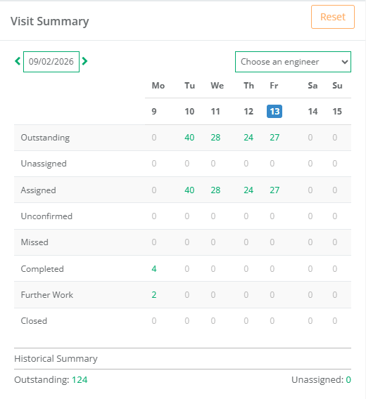 Clicking Reset will return the date and selected engineer to the default.