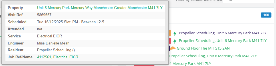 Clicking on a visit in this list will open a new tab with the visit page you have selected. Alternatively, you can hover your mouse over a visit on the list to get a summarised view of the visit information.