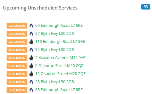 This section shows a list of all the properties which have a service deadline coming up. This can be used to see which properties you may need to contact or book a visit for to make sure you are keeping within the service deadline. The total number of upcoming services can be seen in the top right.