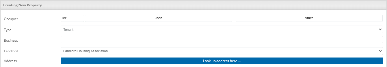 Select the property type from the drop-down. This details if the property is private, occupied by a tenant or is a landlord. If it is a tenanted property you will also need to select the landlord associated with this property.