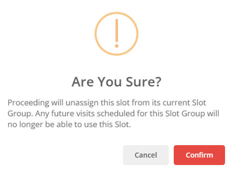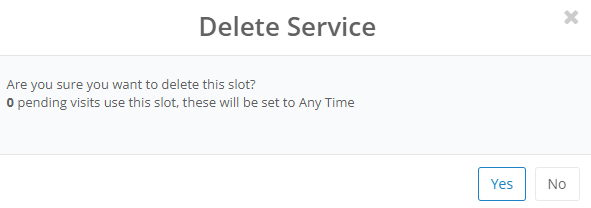 To delete a slot, select Delete to the right of the slot. From here, you will be prompted to confirm the deletion. It will also notify the number of visits that are assigned to that slot. If there are visits assigned and you proceed with deleting the slot, the visits will still be scheduled on the same day, however, they will be set to Any Time.