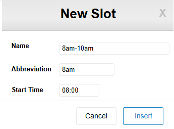 Once the fields have been entered, select Insert to create the slot.