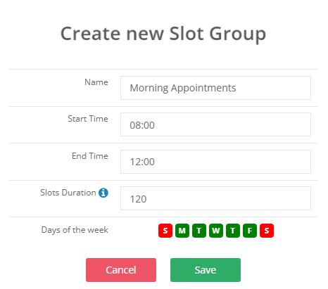 To create a slot group, select Add New Slot Group. Here, you will be prompted to enter the group's name, the start/end time of the slot, the slot duration and the days of the week it applies to. You can either select the time from the drop down, or enter one manually.