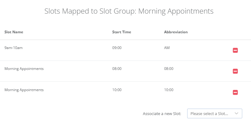 To add an additional slot to the group, select the drop down in the bottom right. This will display all the existing appointment slots in the system. Select one and click Add to add the new slot to the group.