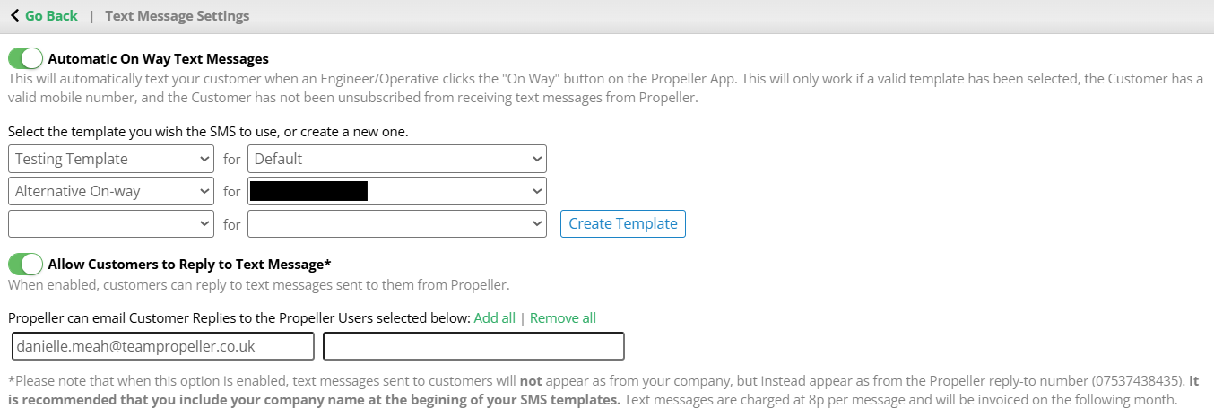 Please Note: When this option is enabled, text messages sent to customers will not appear as from your company, but instead appear as from the Propeller reply-to number (07537438435). It is recommended that you include your company name at the beginning of your SMS templates. Text messages are charged at 8p per message and will be invoiced on the following month.