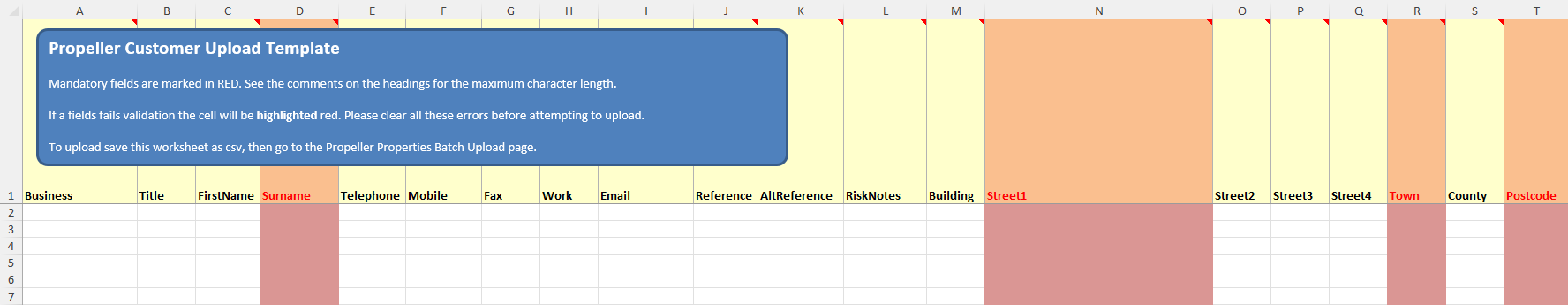 This template includes all the columns required to upload a property. All the columns highlighted in red are mandatory for the property upload.