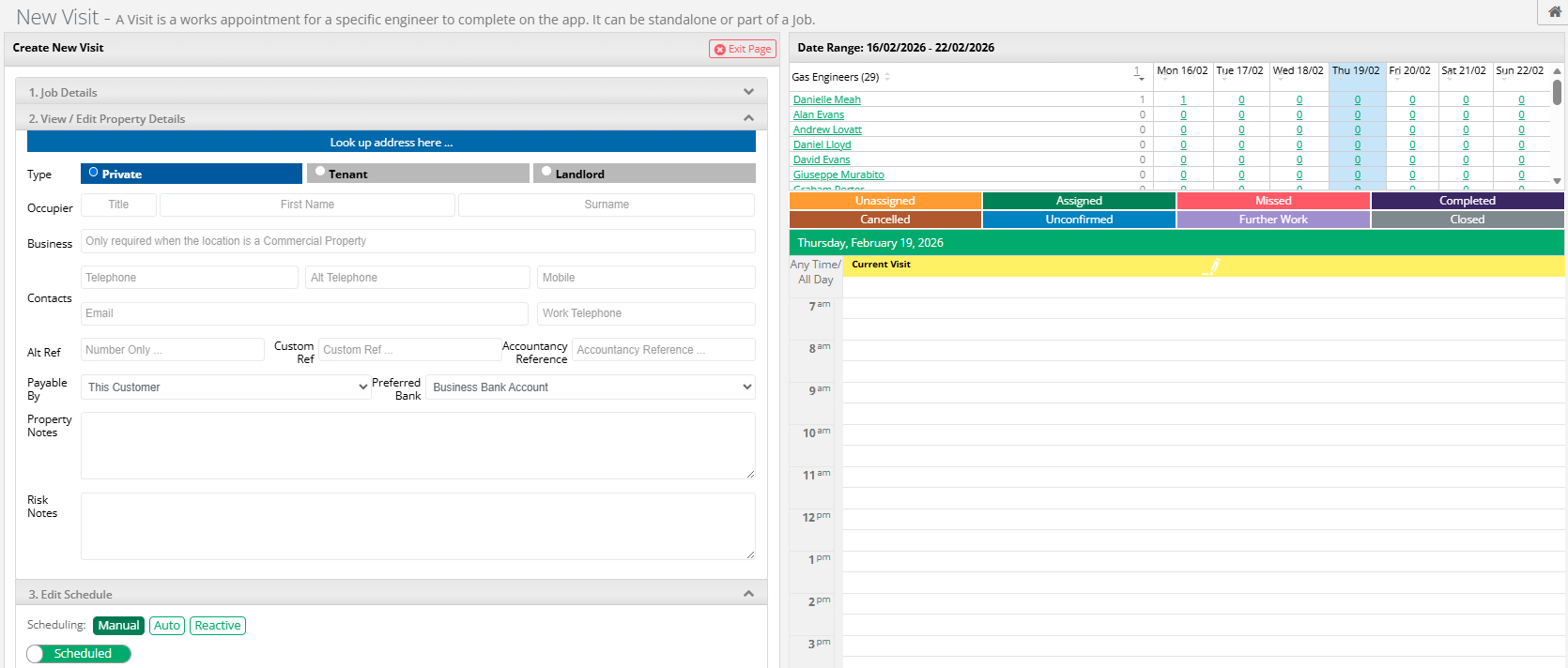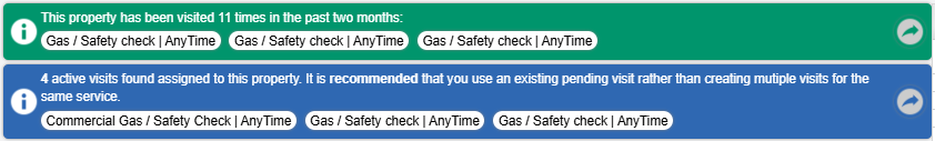 In our example visit we have other visits against this address, therefore this is highlighted in blue at the top of the left column. If an existing visit for the property is the same visit type as the one being created, it is recommended to update the existing visit, rather than create a new one.
