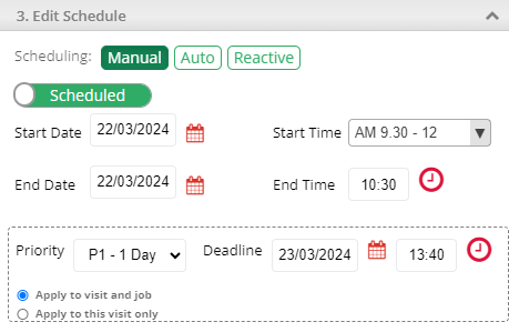 However, if you would like to schedule these works you can do this Manually, Automatically or Reactively by selecting the option at the top of the Edit Schedule section.