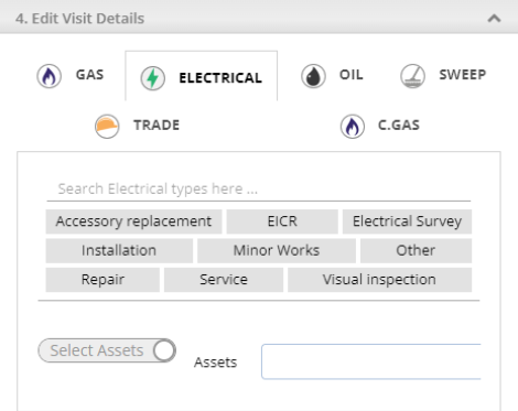 Here you can select the trade type as well as the activity type for the visit. These will change depending on what engineer is assigned and what works they can carry out. You can also select which assets to create a visit for, or by default all assets for that property/type.
