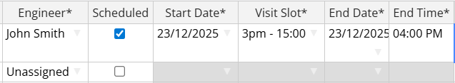 Visits can also be scheduled in the bulk creator. In order to do this, check the 'Scheduled' box, then assign a start date, as well as a visit time. Based on these details, the creator will automatically enter an end date and end time, however these can be changed. An engineer can also be assigned. Uncheck the 'Scheduled' box if the visit is to remain unscheduled.