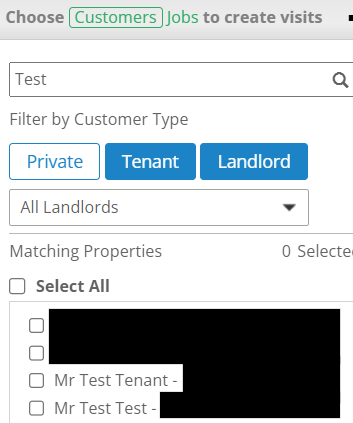 The location of the visits can be selected to the left of the visit creator. These can either be searched via the bar along the top, filtered by customer type or found within the list.