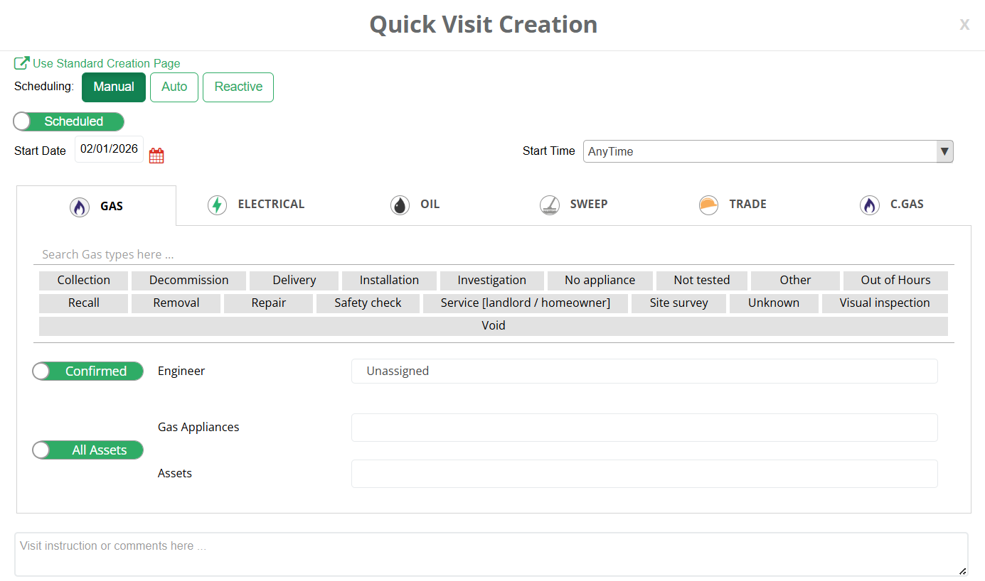 Conversely, if the visit needs to be created, select Quick Visit Creation. From here, details can be added in the same process as adding a visit. Once these details have been entered, select Create Visit. An engineer can be assigned and alerted of this visit too, however, other engineers attending the visit will have to be added after the visit's creation.