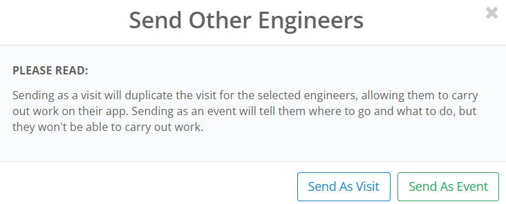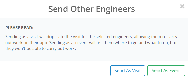 Sending as an event is preferable if the engineers attending the job are conducting the same work and do not need to create separate reports. As a result of this, only the primary engineer can fill out the reports for the visit on the app with both engineers taking credit for the work.