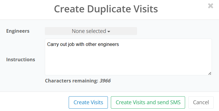 Sending as a visit will send the job as individual visits to the engineers. This is ideal if the engineers are completing different work (for example, a trade engineer and an electrician). Through doing this, the engineers can create their own reports on their apps separately, but all sets of reports are encompassed under the same job.