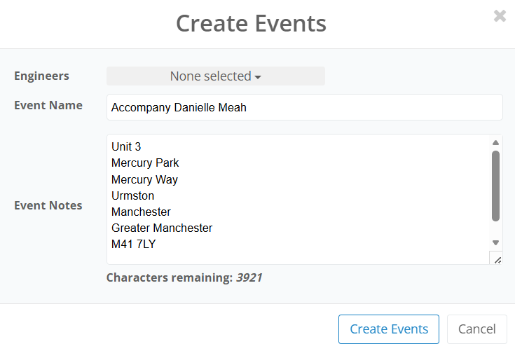 Once Send as Event is selected, the event details will be automictically filled out. The title will be the engineer that is being assisted, with the property location detailed in the event notes. These can be changed manually.