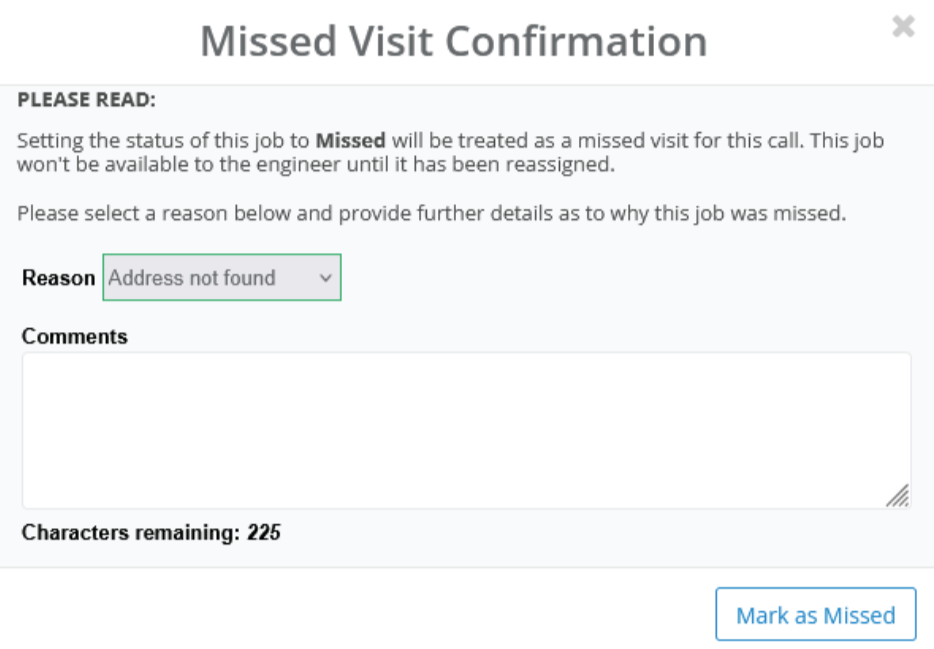 A visit may be marked as missed when the engineer cannot attend due to reasons such as: