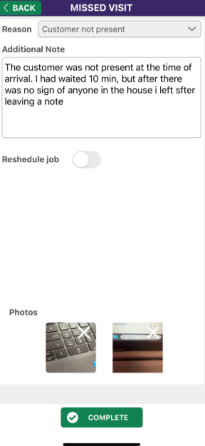 In this image there is a reason for the missed visit as well as the additional notes down below. Furthermore there are 2 photos that have to be taken which will store time/date and location data if enabled.
