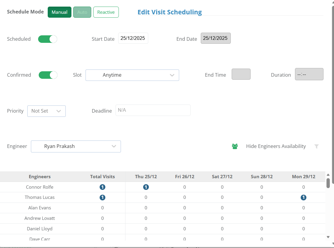 Once clicking the "Create Further Visit" option, it leads you towards this page which will allow you to select a start date, end date time and other priorities for the engineer. After these details are filled in, the visit can be scheduled and a new visit will be created in the system.