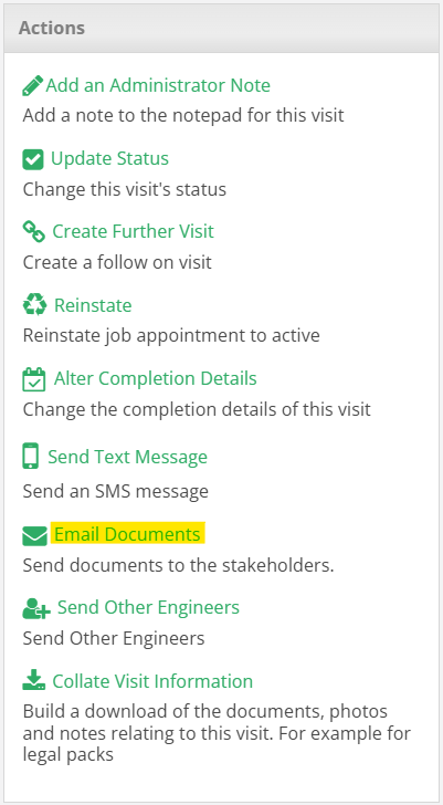 To email the required documents, first navigate to the desired job/visit. To the left of the visit in the Actions panel , select the Email Documents button.