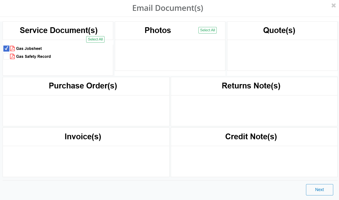 This will then showcase the different documents associated with the visit. You can either select the documents to send individually, or Select All for each category. Once the documents are selected, click Next.